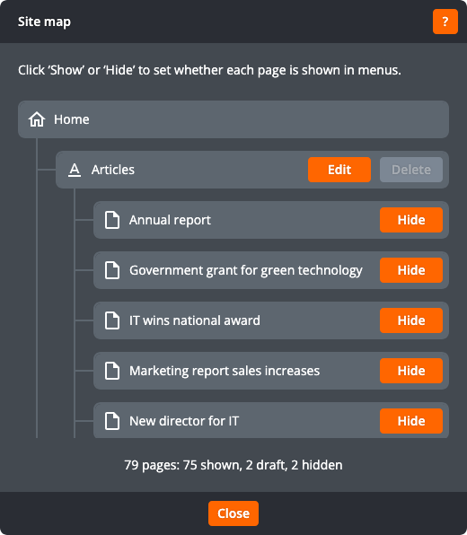 In some situations you may want to hide a page from the navigation — for example, a landing page for an e-mail newsletter. Note that a hidden page is still accessible to anyone who knows its address. For addition protection, a page can be password-protected.