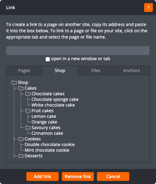 To link to shop categories and products on your site, click on the Shop tab in the link window and then click on the name of the category or product: