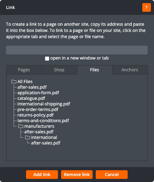 To link to files that you have uploaded to your site, click on the Files tab in the link window and then click on the name of the file: