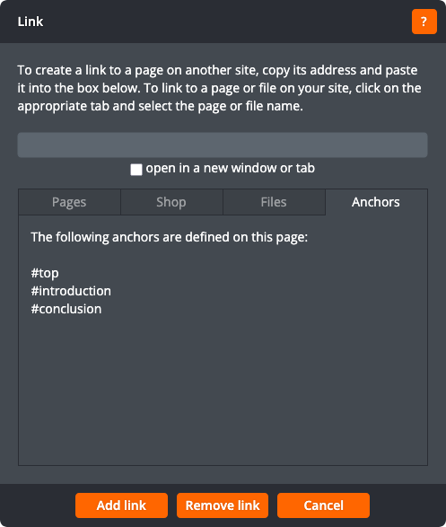 To link to pages on your site, click on the Pages tab in the link window and then click on the name of the page. The address of the page will then be copied into the field at the top of the link window. Note that the address starts with /, which ensures that the link is relative to your home page and will continue to work even if you later change your domain name.