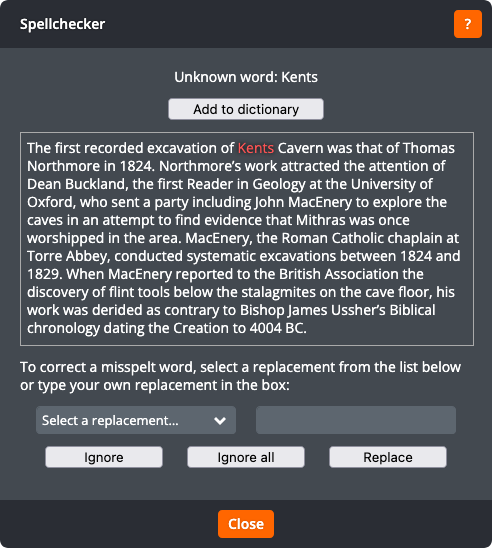 For each unrecognised word, you can choose to add it to the dictionary, ignore this occurrence, ignore all occurrences, replace the word with one of the suggestions, or type a replacement.