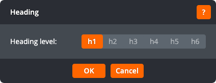The heading window lets you choose a heading level. The h1 level should be used for the main heading on the page, the h2 level for sub-headings, and so on.