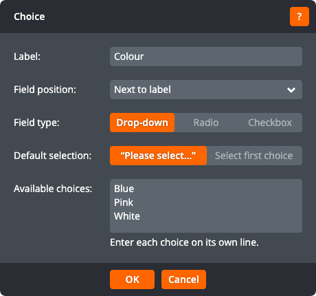 The choice can take the form of a drop-down menu, radio buttons, or checkboxes, as shown below. Drop-down menus and radio buttons allows a single choice to be selected, while checkboxes allow multiple choices to be selected.