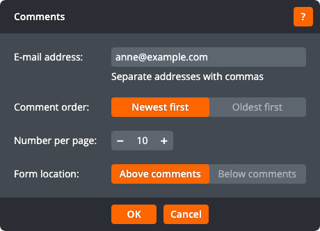 Click OK to apply the changes to the comments component. Click Cancel to return to the page without changing the comments component.