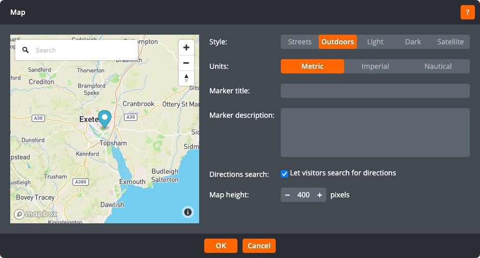 Maps can display a directions search feature, making it easy for your visitors to find how to get to you: