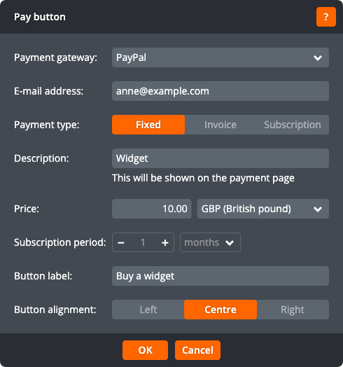 Click OK to apply the changes to the pay button. Click Cancel to return to the page without changing the pay button.